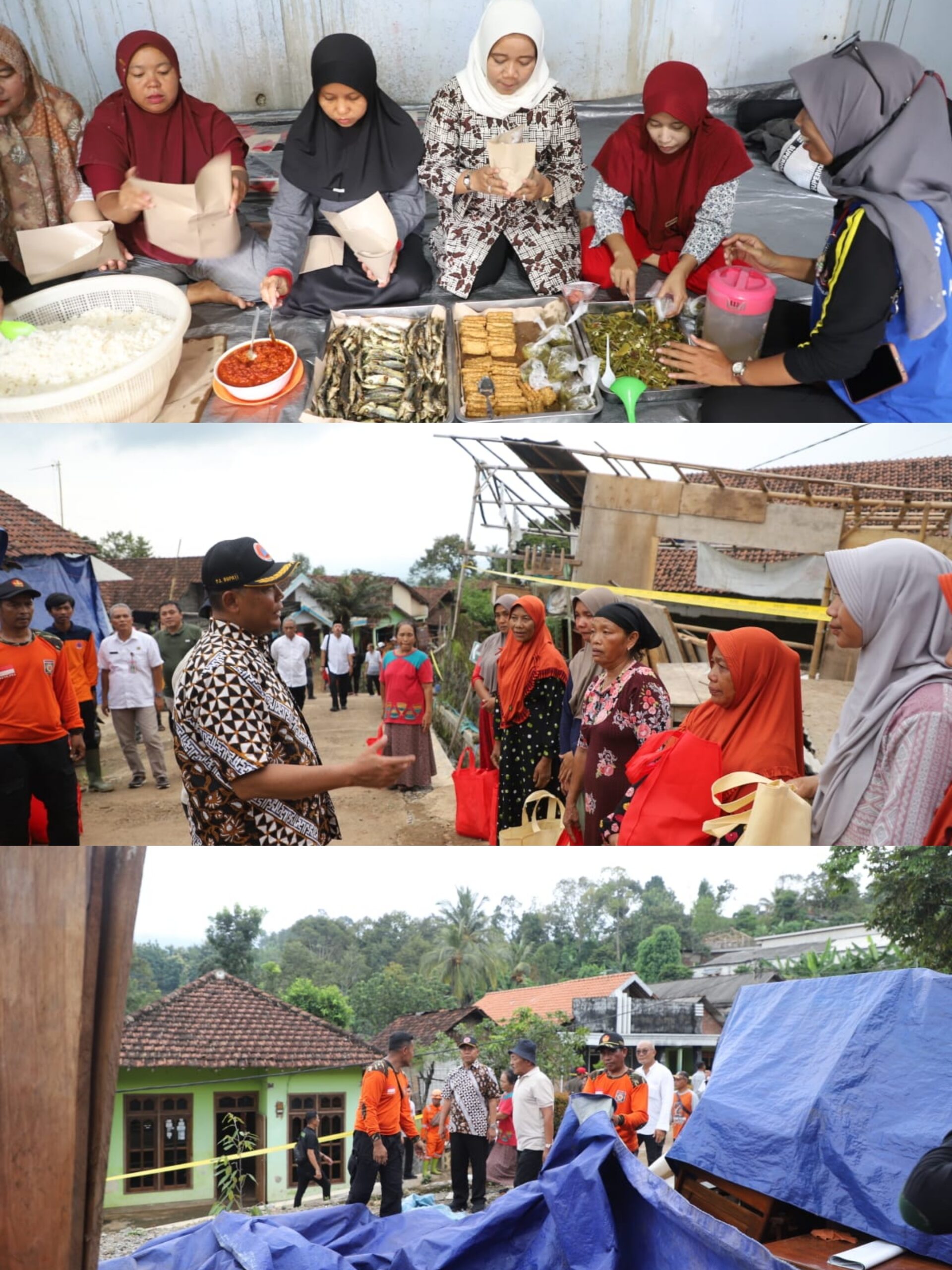 Tampak di dapur umum yang ada di Balai Desa Sambirejo, Pj Ketua Tim Penggerak PKK Yayuk Sugiat membantu menyiapkan nasi bungkus untuk warga terdampak. Tim Tagana juga membagikan makanan langsung kepada warga. Dalam sehari tak kurang 450 bungkus nasi di berikan kepada warga terdampak bencana tanah gerak.(Syim/ADV)