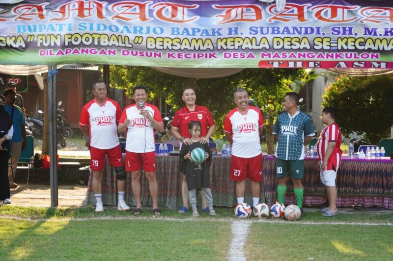 Sidoarjo, IndexBerita.com – Bupati Sidoarjo, Subandi bersama Dandim 0816 Sidoarjo Letkol Inf Dedyk Wahyu Widodo ikut fun football dengan Persaudaraan Kepala Desa Indonesia Kecamatan Sukodono.