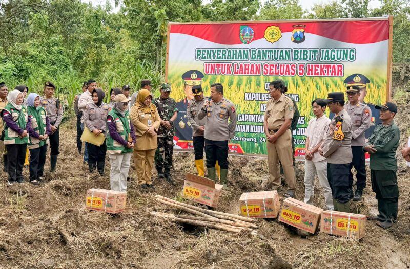 Jombang . Indexberita.com Dalam rangka mendukung program swasembada pangan nasional, Kapolres Jombang AKBP Ardi Kurniawan, S.H., S.I.K., CPHR menyerahkan bantuan 1 Kwintal bibit jagung jenis Bisi-18 untuk lahan seluas 5 hektare kepada Gabungan Kelompok Tani (Gapoktan) Desa Katemas, Kecamatan Kudu, Kabupaten Jombang, Selasa (24/2/2026).